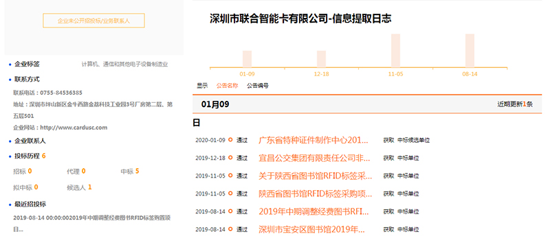 深圳市聯(lián)合智能卡有限公司憑借先進生產(chǎn)設備和資質齊全,在2019年~2020年投標6個項目實際中標5個,1個候選;達到83%概率,證明深圳市聯(lián)合智能卡有限公司實力。以下是在投標網(wǎng)站顯示聯(lián)合智能投標情況: